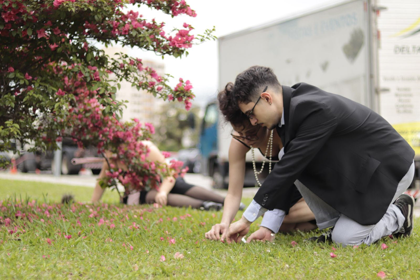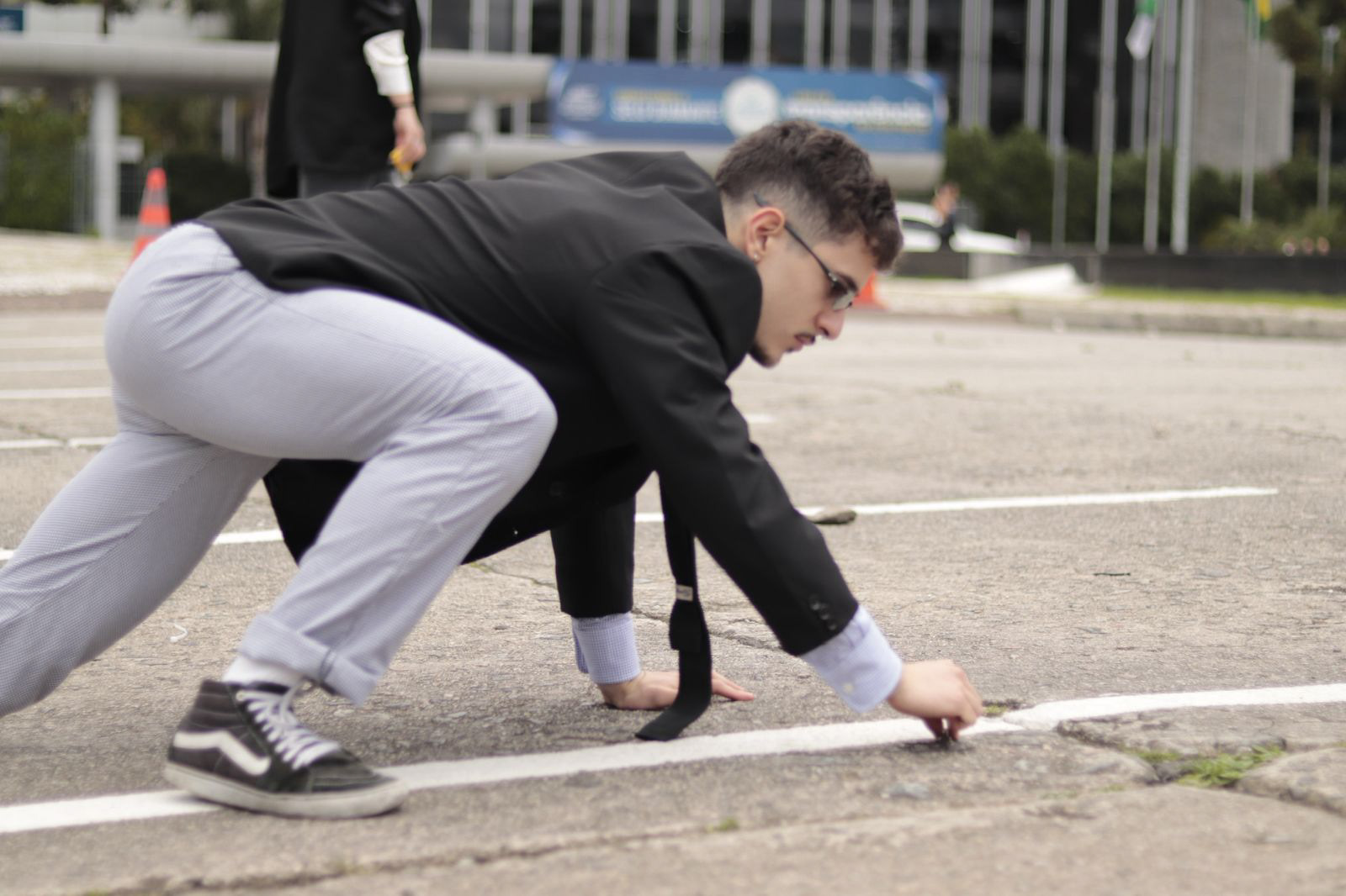 Trajados com peças de roupa vermelha, alunos da EMBAP e da FAP deitaram-se em fila sobre a calçada, alinhando seus corpos em uma sequência precisa. Durante uma hora, permaneceram em silêncio, compondo uma imagem que ressignifica a ocupação do espaço público. Mais do que uma pausa, seu gesto transformou-se em acolhimento: um grande tapete vermelho humano para recepcionar estudantes do ensino médio.